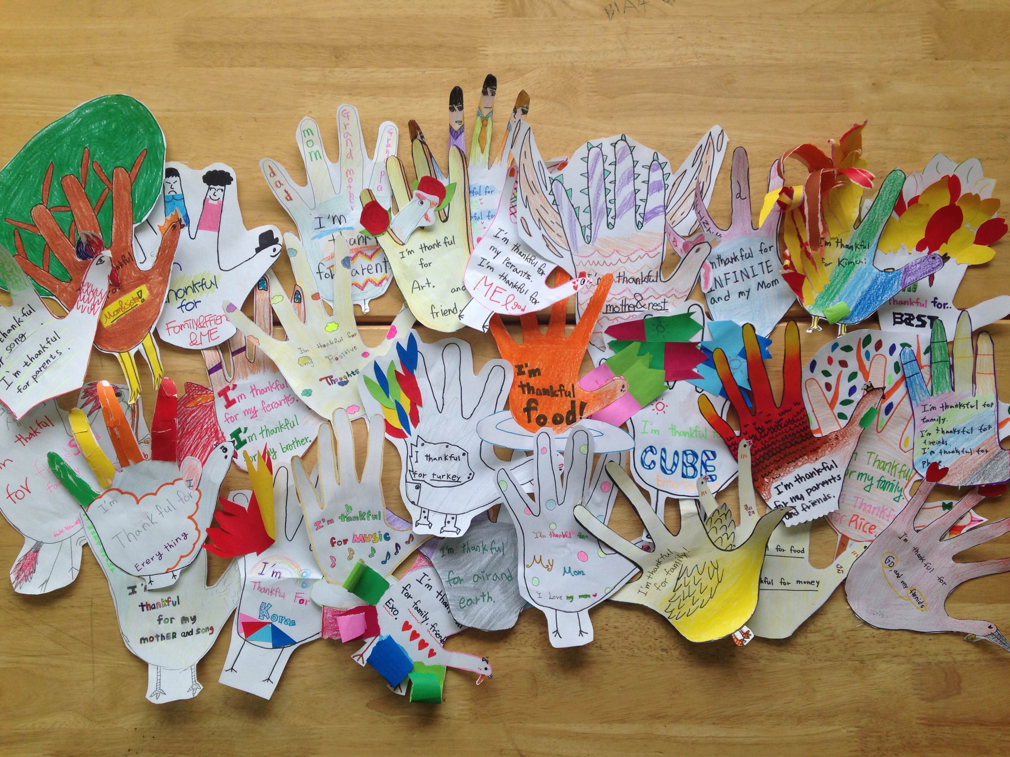 My Korean students’ hand turkeys. Assignment was to write what they were most thankful for. 🙂 Click image to view more closely, then click again to zoom!