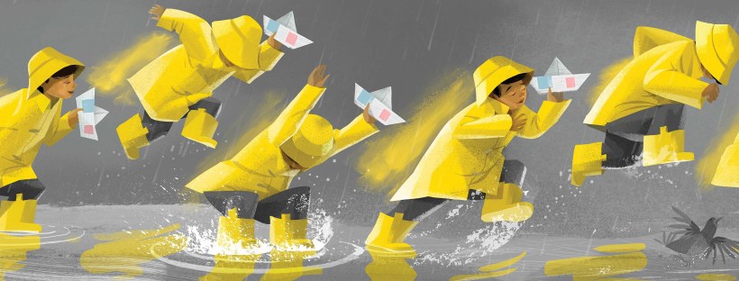 Daniel: I was on a plane flying home from my Aunt’s funeral. It had been raining so I did a drawing of a little boy floating a paper boat in a puddle. I wondered what happened before that moment and drew that. Then I wondered what happened after that moment and drew that. I went on like this until I found the beginning and end of the story. The book making process is quite long and requires you to stay focused on what’s best for the story throughout. That’s how I know I’m working with good collaborators- if they honestly critique with that lens. Hurdle one for me with Float was should it have words or not. It seemed like a strong visual narrative that took you to all the emotional places necessary without words, but I wasn’t sure. I tried a whole string of variations on the manuscript, but none of it seemed to say anything that the pictures weren’t. My editor Kristin Ostby at S&S was great about helping to weigh and measure that. At one point I wrote a sound poem for the story. I’d still like to do something with it someday. I’m actually thinking of trying to do some readings of Float in the music rooms of elementary schools instead of a regular class. I figured the children could help tell the story with the instruments. Kind of a rainy day orchestra! Another hurdle or edit was how to get all the emotional beats into the story in an interesting way. Panels seemed like a logical way to pace things out and reveal information as the reader needed it. It was just another layer of design that became really important once I got into building the book.