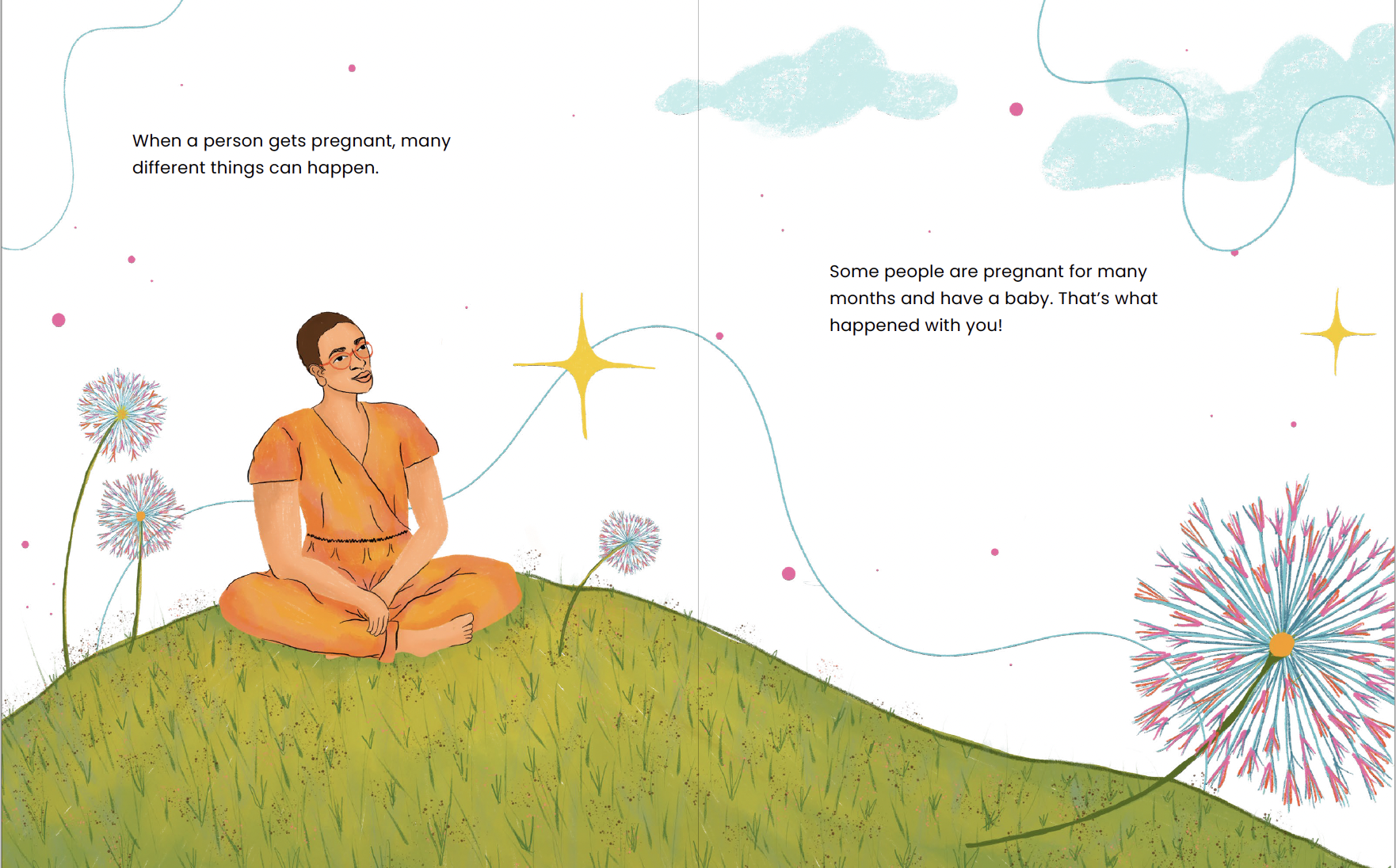 What I love about this picture book is that it is straightforward, pretty and thoughtful. Carly Manes takes great care with her words to ensure that the inclusive language of the book shines & reassures. The words “people” and “persons” are used throughout to remind readers that cis gender women are not the only people who get pregnant and have abortions. This is an important detail. The book, overall, has an extremely chill and comforting vibe, which is achieved through careful choice of words, sparse layout of the spreads and bright and earthy colors. Manes takes the time to delve into the importance of feelings and choices when describing what people who have abortions experience.