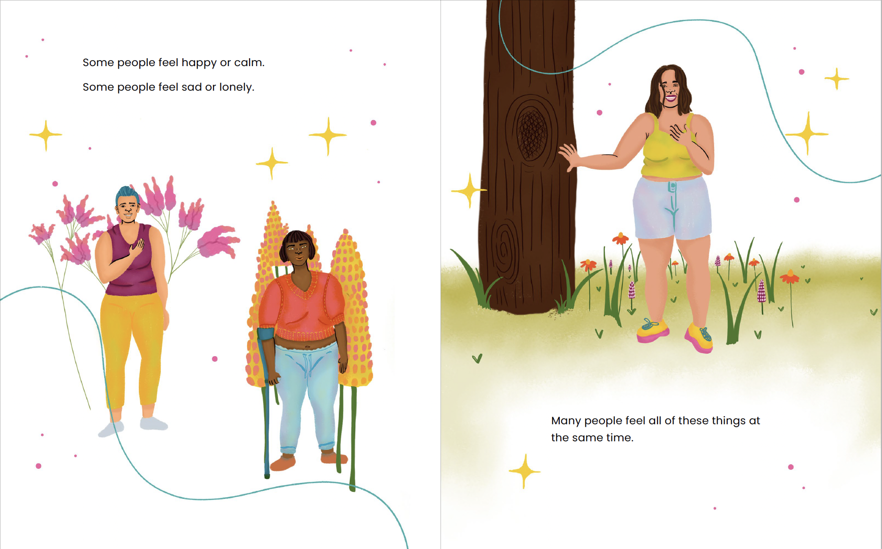 As you read the book, you’ll notice a thin, curved line & bright sparkles that joyfully zip through every spread. This illustrative detail adds levity and a feeling of connectedness as the reader flows through the book. I also especially love the spread where a dark-skinned person with bright pink cornrows stands on the left side of the page while a health clinic sits on the other side, a wide expanse of road connecting them. I believe this scene might depict the experience of many people who have abortions; it is often a contemplative journey. Emulsify really packs a lot of storytelling into this particular spread through excellent use of space & vivid color.
