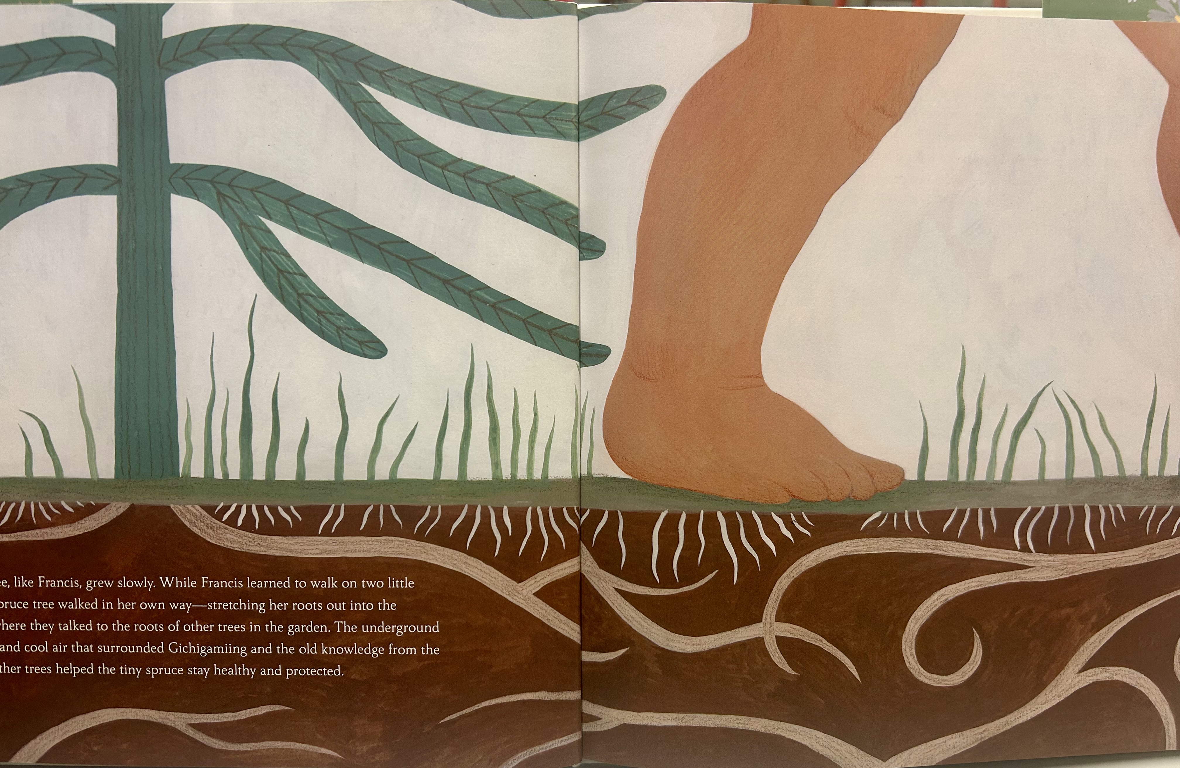 Gardiner works in gouache and colored pencil and likes to play with white space, flora and fauna borders, and layered and flat perspectives. I bet, if she wanted to, she would excel at paper art illustration, as some of the spreads in A Family Tree mimic dioramas with how she meticulously layers front flora, humans/animals, middle flora/grass, background trees and faraway landscape. She loves a good side profile, which encourages the reader to focus in and pay attention. As much as she likes a wide shot, she also loves a zoom-in spread; the spread with little Francis’ chunky feet flat on the ground above a cross-section of Gaawaandagoonce’s strong roots in the soil is lovely. The colors Gardiner uses in this book are muted, cloudy, and rich, in tones of stone greys, seafoam greens, light blues, and earthen browns. It’s a beautiful story of family that you should check out if you haven’t already.