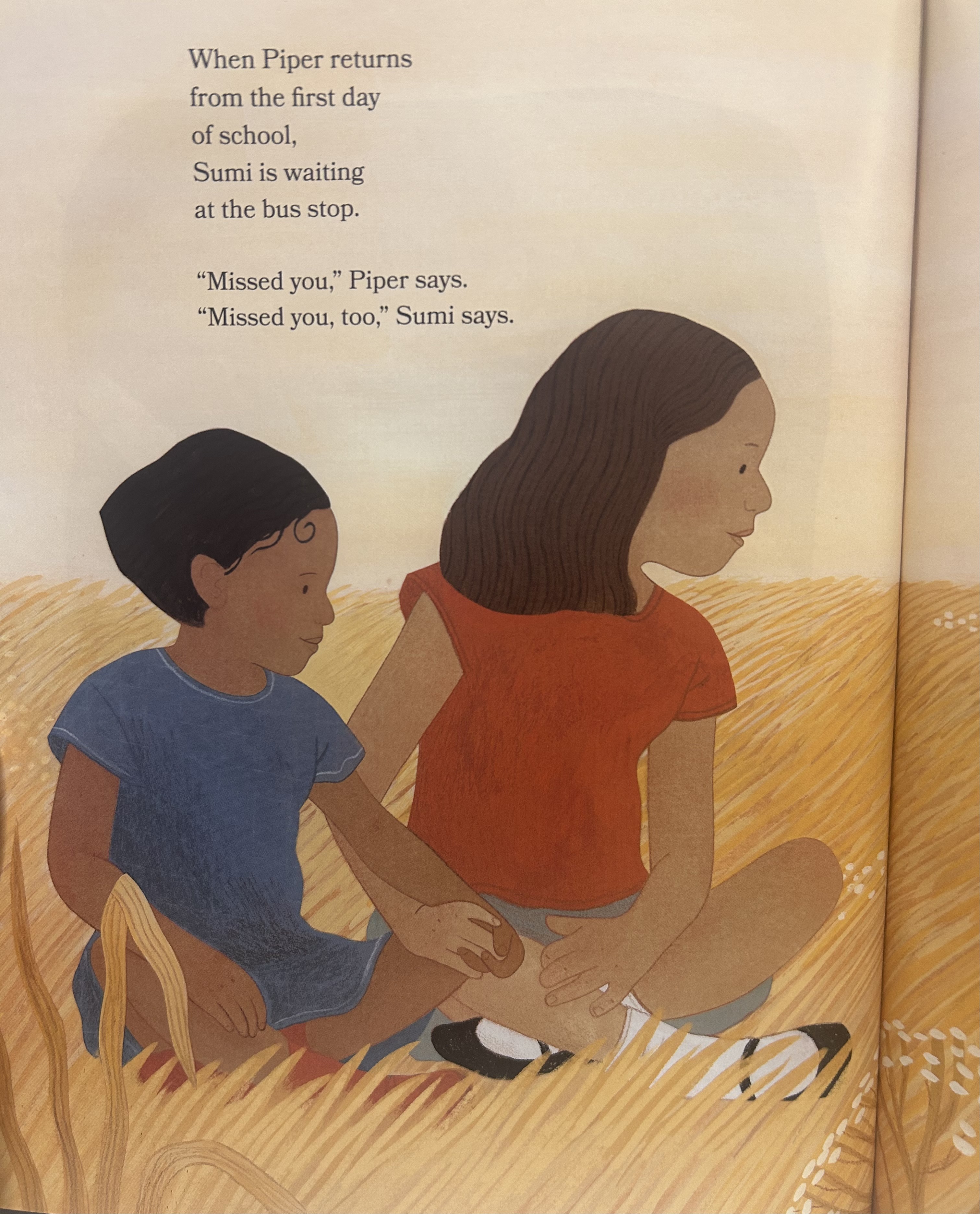 In Firefly Season, Gardiner’s palette is a little darker and warmer, which makes sense because a lot of the story takes place on warm summer nights and at the beginning of fall season. Leitich Smith tells a story about spending time back home with cousins, change, finding new family, sharing culture, making lasting memories, and playing with koleppa (fireflies). Piper and her cousins soak up the gifts of summer on their family’s land in Cherokee Nation and Muscogee Nation and Piper and Sumi’s friendship is patient and tender. Just like in A Family Tree, Gardiner plays with perspective, encouraging readers eyes to jump from one corner of the page to the next, searching for all the layers of connection packed into a scene (though the scenes never feel cluttered). Gardiner also loves a soft sunrise scene. My favorite spread in this book is when Piper and Sumi sit cross-legged in a field of tawny grass in hues of gold, brown, and tan, hands clasped together, faces in profile, as they gaze at two cream-colored bunnies. It is a calm and beautiful scene. I can’t wait to dive into more of Gardiner’s work & will keep an eager eye out for her next books. Do let me know what you think if your read these.